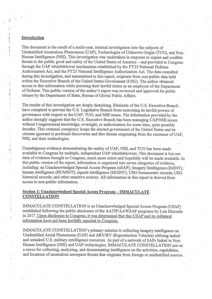 UAP、NHI、TUOの実在を示す明確な証拠は、複数の独立したUAP内部告発者によって議会に提供されてきた。本書はその一証拠に過ぎず、さらに多くの証拠が存在し、将来的に提供されることが望まれる。本公開版報告書では、証拠は以下の7つのカテゴリーに整理されている:未承認特別アクセス計画(uSAP)、画像情報(IMINT)、人的情報(HUMINT)、通信情報(SIGINT)、米国政府の官僚記録、米国政府の歴史記録、その他の機密情報。本報告書に含まれる情報はすべて非公開情報へのアクセスに基づいている。